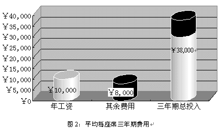就中國目前的經(jīng)濟水平而言,一個座席人員年收入(包括工資、獎金、福利等等)大約為¥10,000,而每個座席人員所配備的軟硬件設施合計約為¥5,000;據(jù)專業(yè)機構(gòu)統(tǒng)計,中國的座席人員平均穩(wěn)定的工作年限為三年,而在這三年為了保證座席人員能夠準確、高效的實現(xiàn)對用戶提供專業(yè)服務,所投入的培訓費用大約為¥3,000。所以在三年期間為每個座席的平均花費為¥38,000。