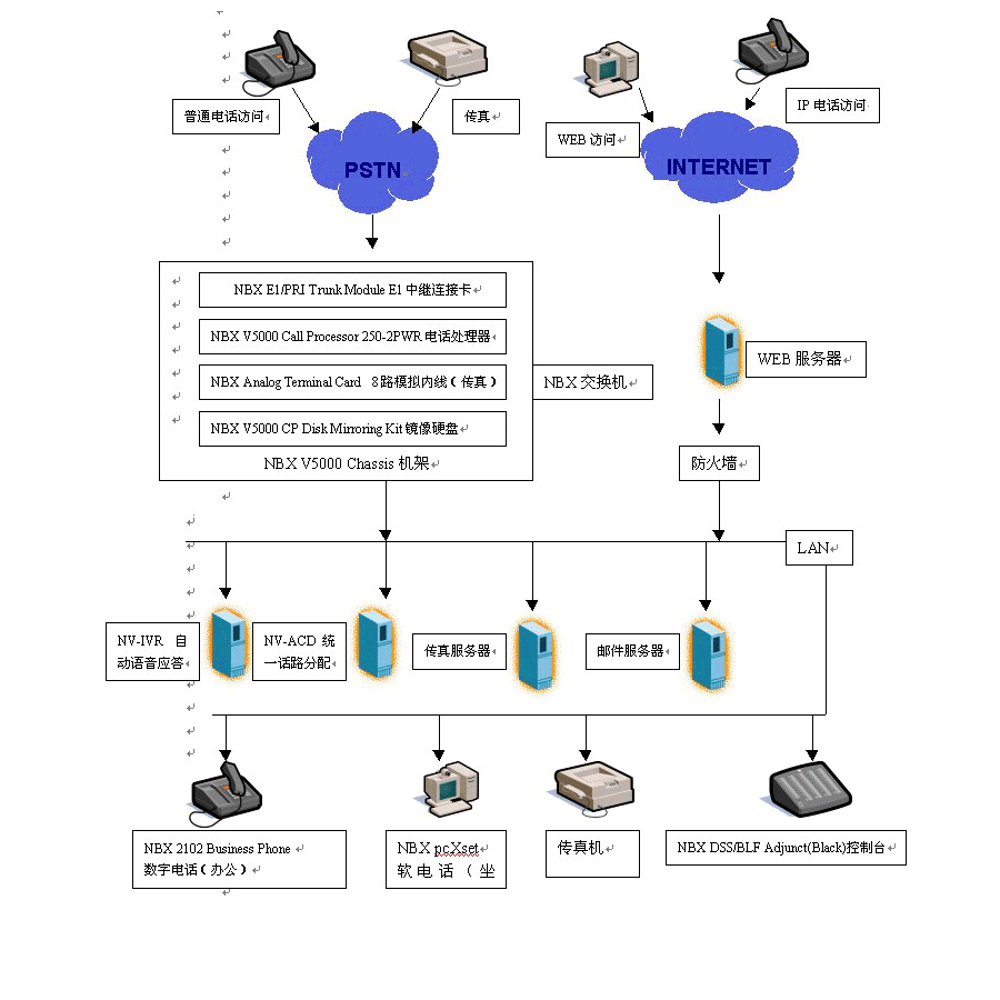 北京晨報(bào)的客戶服務(wù)中心項(xiàng)目是一個(gè)集呼叫中心與辦公系統(tǒng)于一體的語音、數(shù)據(jù)服務(wù)平臺(tái)。通過一條E1中繼線與外部電話網(wǎng)相聯(lián)。內(nèi)部使用50部數(shù)字電話進(jìn)行處理辦公業(yè)務(wù),10個(gè)呼叫中心坐席采用計(jì)算機(jī)的軟電話(pcXset)實(shí)現(xiàn)與客戶的交談,傳真服務(wù)器通過NBX所提供的8條模擬內(nèi)線與外界互通。