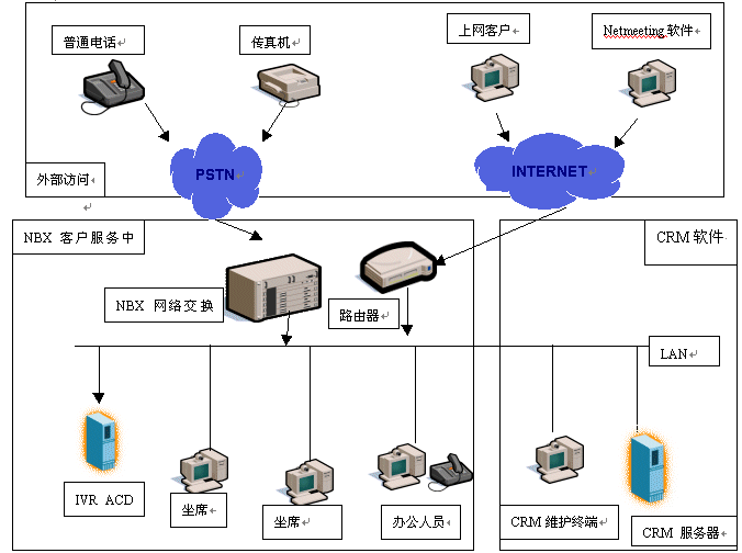NBX客戶服務中心是基于3Com公司的NBX網絡電話交換機平臺構筑的新一代呼叫中心,首先它擴大了服務方式,客戶不但可以通過電話得到服務,還可以在上網訪問企業(yè)主頁的同時使用耳機、麥克風直接與服務代理人員(AGENT)語音通話,一邊瀏覽網頁,一邊交談,增加交流的信息輔助量。還可以通過電子郵件、傳真等方式完成與企業(yè)信息交流,其次NBX客戶服務中心內部數據、語音兩網合一的布線結構,不但提高了呼叫中心的穩(wěn)定性,而且使客戶數據能與電話語音同步協(xié)調,完成具有針對性的一對一的客戶服務。
