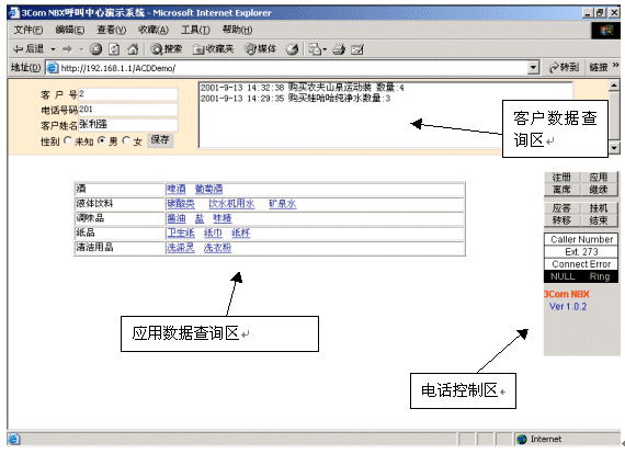 NV-AGENTControl和NV-AGENTPad。NV-AGENTControl是基于ActiveX的Ocx控件,利用該控件,第三方開發(fā)商可以自行開發(fā)界面,非常簡單地實(shí)現(xiàn)座席工號注冊、呼叫應(yīng)答、電話外撥等功能。NV-AGENTPad是在NV-AGENTControl之上開發(fā)的一個座席應(yīng)用解決方案,它通過瀏覽器方式運(yùn)行,第三方開發(fā)商基本上可以不進(jìn)行任何有關(guān)呼叫控制方面的開發(fā),就可以將自己的應(yīng)用系統(tǒng)和NBX系統(tǒng)完整集成。