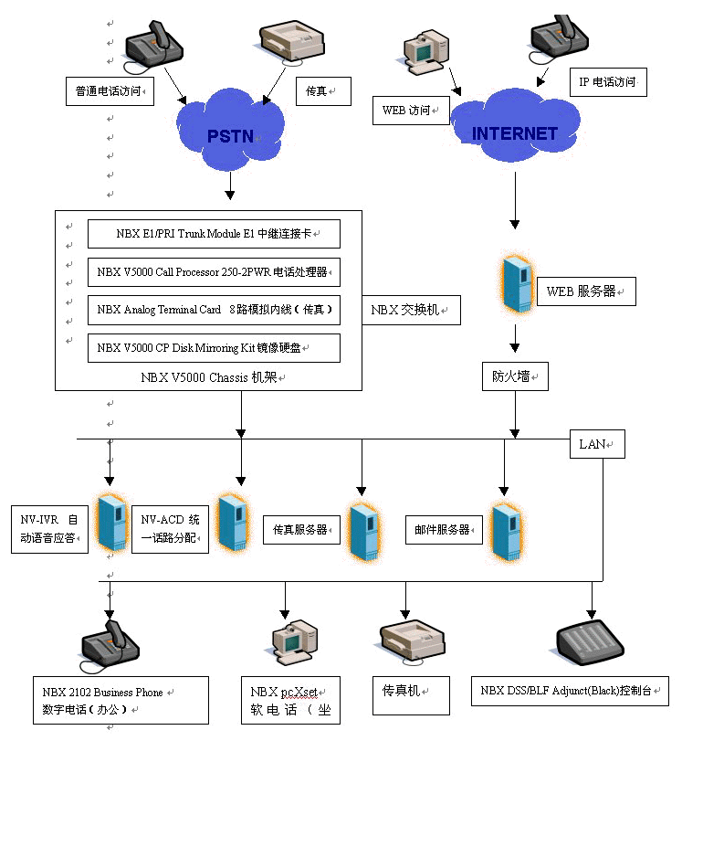 基于NBX的呼叫中心對外支持PSTN、IP兩種接入方式,可以實(shí)現(xiàn)各種接入:普通電話、傳真、IP電話、郵件、WEB訪問,NBX呼叫中心在技術(shù)上實(shí)現(xiàn)革命性的突破,在內(nèi)部實(shí)行語音數(shù)據(jù)兩網(wǎng)合一,將外部的模擬數(shù)據(jù)轉(zhuǎn)換為以太網(wǎng)數(shù)據(jù)包,由NV-ACD實(shí)現(xiàn)外部各種訪問的統(tǒng)一路由分配。