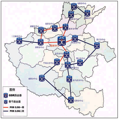 HERNET一期工程主干網采用IP POS技術,應用AVVID網絡體系結構,采用骨干傳輸網、城域網、接入網三層設計方案,以省網絡中心(設在鄭州大學網絡中心)、地市網絡中心、校園網三級管理模式。由省網絡中心向下以2.5G速度連接到各地市網絡中心,而向上則以155M速度連接到CERNET及Internet。整個一期工程實現了包括鄭州、許昌、平頂山、開封、洛陽、濟源、焦作以及新鄉(xiāng)等7個地市的2.5G連接,并形成了一個環(huán)網狀冗余拓撲結構,確保當網絡的一個節(jié)點出現問題時,數據可以通過其他途徑傳輸到目的地,在一期工程完成后,有40多所大學、中小學等教育與科研單位以千兆速度連接到HERNET上,共有近50萬的用戶能夠充分利用高速帶寬獲得教育網資源。
