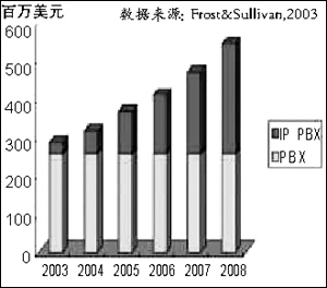 這幾年,IP電話的需求在不斷升溫,尤其在2003年呈快速增長趨勢。目前,全球IP電話市場容量每年為10億美元,預計到2008年,IP電話的市場份額將超過傳統的PBX。據思科公司溫帶策經理介紹,思科在前4年,向全球銷售了100萬臺IP電話,而在2003財年僅僅一年時間里,就銷售了100萬臺IP電話。