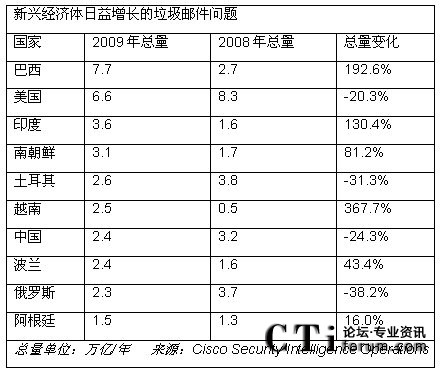 幾個(gè)世界經(jīng)濟(jì)領(lǐng)先的國家在2008年和2009年間垃圾郵件量有所降低;然而,發(fā)展中國家的垃圾郵件量呈現(xiàn)上升趨勢。