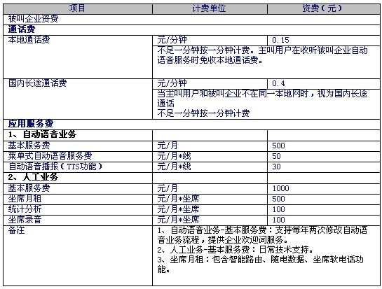 主叫通話費、被叫企業(yè)通話費和應(yīng)用服務(wù)費按虛擬呼叫中心業(yè)務(wù)資費執(zhí)行。
