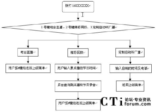 用戶使用時(shí)可通過(guò)固定話機(jī)、小靈通或手機(jī)撥叫業(yè)務(wù)特號(hào)進(jìn)入系統(tǒng),根據(jù)系統(tǒng)的語(yǔ)音提示按鍵選擇收聽不同的電臺(tái)節(jié)目,在收聽廣播的過(guò)程中,可按下電話機(jī)上的#字鍵返回上級(jí)菜單提示音,以滿足用戶在收音過(guò)程中需要不斷調(diào)換頻道的要求。