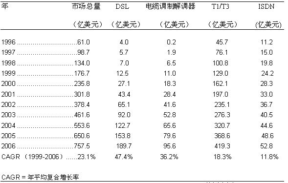 根據(jù) Frost & Sullivan 的預(yù)測, 從1999年到2006年,美國寬帶接入服務(wù)市場的年平均復(fù)合增長率為23.1%。預(yù)計在2006年, 美國寬帶接入服務(wù)的市場總額將高達(dá)757.5億美元。 其中DSL接入服務(wù)的增長幅度最大,年平均復(fù)合增長率高達(dá)47.4%,而DSL市場總額將增長為189.7億美元,占整個市場的26.2%。 電纜調(diào)制解調(diào)器服務(wù)市場的年平均復(fù)合增長率也將高達(dá)36.2%,市場規(guī)模將達(dá)到95.6億美元,占整個寬帶接入市場的12.6% 。而T1/T3數(shù)據(jù)接入專線由于其技術(shù)成熟,在企業(yè)用戶中接受度頗高,它的年平均復(fù)合增長率預(yù)計約為18.3%,市場總額將增至419.3億美元,在整個寬帶接入市場中還是處于統(tǒng)治地位,占整個市場的55.3%。 而ISDN接入服務(wù)的增長則較為緩慢,年平均復(fù)合增長率將僅為11.8%,市場規(guī)模約是52.3億美元,占整個寬帶接入市場的5.9%。