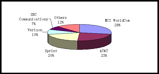 2000年, 美國寬帶互動視頻服務(wù)市場中, MCI WorldCom 是最大的贏家,它所占的市場份額約為28%;其次是AT&T 和Sprint,它們的市場份額分別是23%和20%。