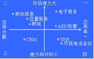 * 第三象限:市場(chǎng)潛力比較小,應(yīng)用比較分散。由于經(jīng)營靈活,貼近客戶,小服務(wù)提供商在此會(huì)有非常大的優(yōu)勢(shì)。大型運(yùn)營商如想經(jīng)營此象限內(nèi)的業(yè)務(wù),必須努力減小不同用戶需求的差異,并造成成本領(lǐng)先。如客戶關(guān)系管理(CRM)。
