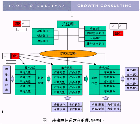 Frost & Sullivan(中國)公司深入研究國際主流運營商的組織結(jié)構(gòu)與管理模式,同時參考了國際上公認(rèn)的eTOM模型,并結(jié)合國內(nèi)電信運營商組織結(jié)構(gòu)的現(xiàn)狀,提出了圖1所示的未來電信運營商的理想架構(gòu)。理想架構(gòu)的確定對電信運營管理的變革具有重要的意義。只有事先明確了方向,并且對未來達成了廣泛一致的共識,才能對目標(biāo)過程進行分解,有步驟、有方法、有成效的完成目標(biāo)。