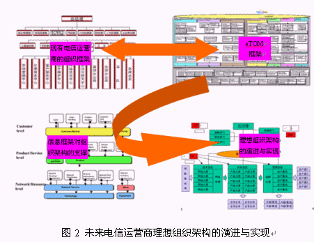 現(xiàn)有的電信運營商的管理架構(gòu)向理想的管理組織架構(gòu)演進過程中,要涉及到不同的中間過程和步驟,對中間過渡狀態(tài)的評估和有效實現(xiàn),是實現(xiàn)演進的關(guān)鍵,F(xiàn)有組織架構(gòu)管理職能的對應(yīng),業(yè)務(wù)流程的標(biāo)準(zhǔn)化,管理流程的標(biāo)準(zhǔn)化,企業(yè)IT支撐架構(gòu)對業(yè)務(wù)職能部門的支撐,這些環(huán)節(jié)都是運營商應(yīng)該重點考慮的中間內(nèi)容。圖2顯示了未來電信運營商理想組織架構(gòu)的演進與實現(xiàn)過程。其中的任何一個環(huán)節(jié)都是電信運營管理研究的核心課題,也直接影響到了電信運營管理變革的成敗。