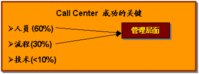 企業(yè)必須牢記在心,成功運營呼叫中心的三要素 人員、流程和技術,三項缺一不可,而更重要的是如何適當?shù)卣线@三項要素。鑒于以往經(jīng)驗,呼叫中心的成功與否,人的因素占60%,流程因素占30%,而技術因素只占10%。這并不表示可以忽視技術的重要性,技術一樣很重要。如果沒有當今日新月異的科技,企業(yè)便無法實現(xiàn)呼叫中心的運營;而成功地實現(xiàn)呼叫中心有效的管理與運營,關鍵在于管理能力,也就是對人員及流程的把握。