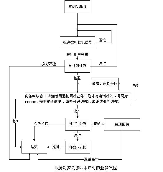 當(dāng)服務(wù)對(duì)象是被叫用戶時(shí),產(chǎn)生遇忙漏話后,東進(jìn)漏話監(jiān)測(cè)設(shè)備(DMCS)實(shí)時(shí)檢測(cè)被叫用戶的掛機(jī)信號(hào),如果被叫掛機(jī),則先向被叫外呼,呼出接通后,語(yǔ)音提示“歡迎使用遇忙回呼業(yè)務(wù),剛才有電話呼入,號(hào)碼為xxxxxx,需要接通請(qǐng)按1,重聽號(hào)碼請(qǐng)按2,取消該業(yè)務(wù)請(qǐng)按3”,如按1,系統(tǒng)向原主叫外呼(亦稱回呼),回呼成功(ACM)后,建立話音回路,進(jìn)一步接續(xù);如回呼原主叫時(shí)遇忙(SLB、STB等),則回呼失敗,向被叫用戶示忙。