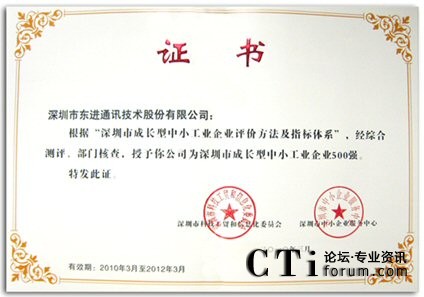 CTI論壇(ctiforum)4月6日消息(記者 潘婷婷):由深圳市政府大力支持,深圳市科工貿(mào)信委、深圳市中小企業(yè)服務(wù)中心,深圳市統(tǒng)計局,深圳大學(xué)管理學(xué)院聯(lián)合組織評測的“深圳市成長型中小工業(yè)企業(yè)500強”,于3月31日被正式認定,深圳市東進通訊技術(shù)股份有限公司榮列其中。今后,作為深圳市中小企業(yè)成長工程的重點培育對象,東進技術(shù)將獲得政府公共資源的傾斜扶持,促進加快發(fā)展,形成“示范效應(yīng)”。