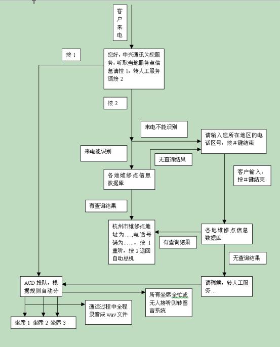 在中興通訊呼叫中心流程設(shè)計(jì)上充分體現(xiàn)了CTI技術(shù)以及數(shù)據(jù)庫技術(shù)等IT技術(shù)與星際先進(jìn)的管理理念的融合。該流程的設(shè)計(jì)保證將主動提高服務(wù)品質(zhì)的工作集中于對呼叫者最重要的環(huán)節(jié)――對維修網(wǎng)點(diǎn)信息的咨詢上。它為所有呼叫者提供了詳細(xì)、精煉、基本的高品質(zhì)電話服務(wù),同時又根據(jù)電話區(qū)號提供了有針對性的咨詢服務(wù)。