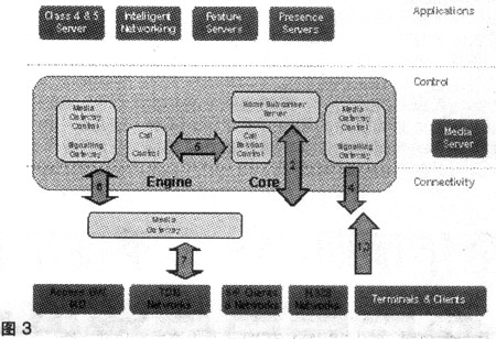 連接層由3個(gè)關(guān)鍵部分組成:用戶設(shè)備、媒體網(wǎng)關(guān)和IP傳輸。ENGINE解決方案的媒體網(wǎng)關(guān)可以支持從很小數(shù)量的用戶擴(kuò)展到數(shù)百萬用戶。本地交換機(jī)、匯接交換機(jī)和用戶交換機(jī)可以接入到媒體網(wǎng)關(guān)。多媒體用戶可通過SIP終端和IAD接入。ENGINE支持采用V5、ISUP、SIP和H.248等各種接入節(jié)點(diǎn)的用戶。在ENGINE解決方案中,媒體網(wǎng)關(guān)同時(shí)也是接入網(wǎng)關(guān),可以實(shí)現(xiàn)C5電話業(yè)務(wù)和基于SIP的寬帶用戶功能。