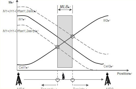 過早、過晚切換是由于目標小區(qū)切換門限過低和過高所致。對應(yīng)過早和過晚臨界切換門限之間的區(qū)間就是合理的移動性優(yōu)化范圍。頻內(nèi)的負載均衡也可以通過調(diào)整切換門限值來引導(dǎo)用戶和負荷由高負荷小區(qū)遷移至低負荷小區(qū),很顯然可調(diào)的門限區(qū)間就是移動性優(yōu)化允許的范圍。這個范圍對應(yīng)相鄰小區(qū)的重覆蓋面積,在LTE中理論上大概相當于正常小區(qū)面積的15%,可操作的價值不是很大。愛立信更傾向于異頻或者異系統(tǒng)的負荷均衡方案,增益比較明顯。如下圖,一個終端從左至右移動,M1、M2分別是接收到eNB1和eNB2的信號強度曲線,兩條曲線相交點對應(yīng)的地理位置處終端接收到的信號強度相同,對cell1到cell2的切換,下面的虛線對應(yīng)過早切換臨界,上面的虛線對應(yīng)過晚切換臨界,兩線與M2相交點對應(yīng)合理切換門限區(qū)間,也是頻內(nèi)負載均衡MLB的可調(diào)范圍。