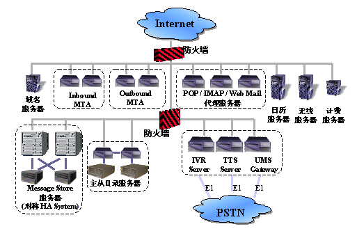 UMS系統(tǒng)的軟件采用Blue-Sillicon公司的UMS軟件,郵件系統(tǒng)為iPlanet Message Server 5.0(iMS 5.0)。Blue-Silicon公司的UMS軟件實(shí)現(xiàn)了上面我們所描述的功能,將電話(huà)、傳真和郵件和為一體,為用戶(hù)提供方便快捷的全方位信息服務(wù)。