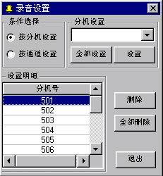 錄音設(shè)置有兩種(見(jiàn)下圖):一種是按分機(jī)設(shè)置,即不管分機(jī)在哪個(gè)內(nèi)線通道,只要通話(包括會(huì)議)就錄音;另一種是把外線通道設(shè)置成錄音通道,并且能自動(dòng)對(duì)IVR過(guò)程進(jìn)行單獨(dú)錄音。