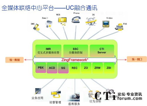 英立訊公司ZingFramework®®全媒體聯(lián)絡(luò)中心平臺基于H.323和SIP等國際標準協(xié)議,通過SOA服務(wù)架構(gòu)實現(xiàn)聯(lián)絡(luò)中心的優(yōu)化計算,為客戶應(yīng)用提供了多媒體服務(wù)處理能力,支持固話、手機、傳真、郵件、短信、互聯(lián)網(wǎng)和Web電話等多種通信方式的接入,以及3G視頻互動和RFID物聯(lián)應(yīng)用,實現(xiàn)多種服務(wù)媒體和通訊渠道的統(tǒng)一融合,并提供統(tǒng)一接入、統(tǒng)一路由、統(tǒng)一排隊、統(tǒng)一服務(wù)、統(tǒng)一處理和回復(fù)的的綜合融合通訊服務(wù)平臺。