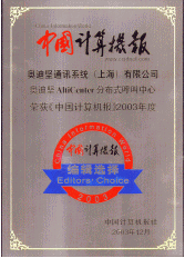 奧迪堅(jiān)基于IP分布式呼叫中心平臺(tái)榮獲中國(guó)計(jì)算機(jī)報(bào)2003年度編輯推薦獎(jiǎng)。《中國(guó)計(jì)算機(jī)報(bào)》(CIW-China