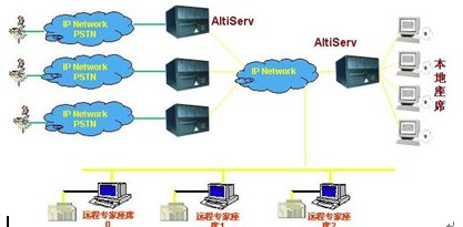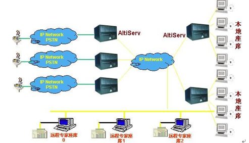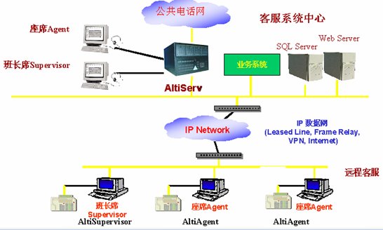 這種組合節(jié)省管理成本,因為所有的座席員都在一點,便于管理控制,同時用戶只要撥打本地電話即可進入系統(tǒng)接收服務,如需人工座席應答的話系統(tǒng)會自動將來電通過Internet轉接到座席員處,對公司的話費成本也較低(都是通過Internet實現(xiàn)的長途轉接功能)。同時AltiGen也支持通過IP分機的方式遠程登錄到系統(tǒng)實現(xiàn)遠程座席的功能,這樣對有些高級話務員或?qū)<易,不必每天到公司上班,可以通過家里的電腦登錄到AltiGen系統(tǒng),作為系統(tǒng)的一個分機來完成所有的座席員的功能,在他的電腦屏幕上也能彈出來電人的信息。系統(tǒng)的組網(wǎng)圖如下: