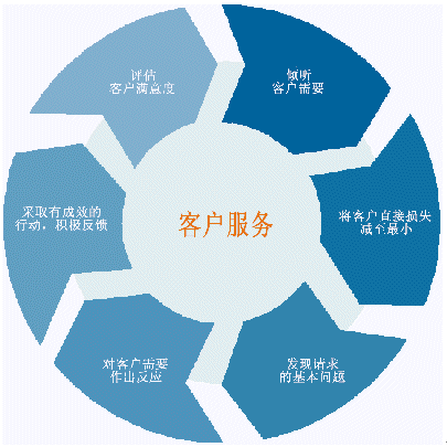 客戶服務(wù)不僅限于把公司提供給客戶使用?蛻舴⻊(wù)是與客戶交互的一個完整過程,包括聽取客戶的問題和要求,對客戶的需要作出反應(yīng)并探詢客戶新的需求。我們真的不能將其看成一個簡單的過程?蛻舴⻊(wù)可以用一個復(fù)雜的循環(huán)來表示,其中不僅僅包括了客戶和客戶服務(wù)部門,實際上包括了整個公司,即把公司整體作為一個受客戶需求驅(qū)動的對象。