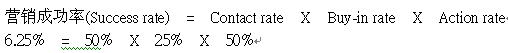rate(接觸率,能夠聯(lián)系到客戶的比率), Buy-in rate(接受率,聯(lián)系到的客戶里面表達有興趣的比率), Action rate(成交率,表達有興趣的客戶里面真正付錢購買的比率)。一般而言,接觸率能達到50%算是不錯的名單,而接受率能達到25%算是產(chǎn)品、名單選擇登對,銷售技巧也到位,最后臨門一腳的成交率應(yīng)該要能到50%算是達標(biāo)了。以下列公式來表達(標(biāo)準(zhǔn)以上述的比率套用):