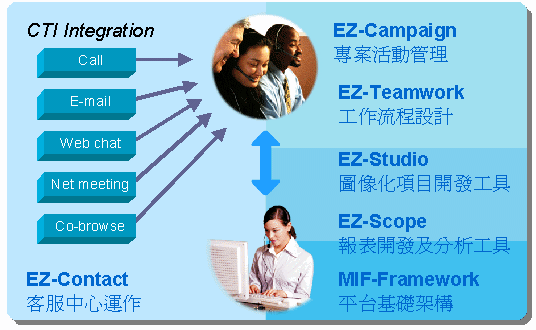 EZactor客服中心CRM平臺(tái)系統(tǒng),以MIF-Framework模塊為平臺(tái)基礎(chǔ)架構(gòu),在該強(qiáng)大之穩(wěn)定架構(gòu)上以EZ-Contact模塊作為客服中心運(yùn)作核心,另外延伸有EZ-Campaign、EZ-Teamwork、EZ-Scope、EZ-Studio等模塊,分別提供營銷活動(dòng)管理、工作流程設(shè)計(jì)、數(shù)據(jù)統(tǒng)計(jì)與分析、項(xiàng)目開發(fā)工具等功能,全面滿足客服中心運(yùn)行之需要。