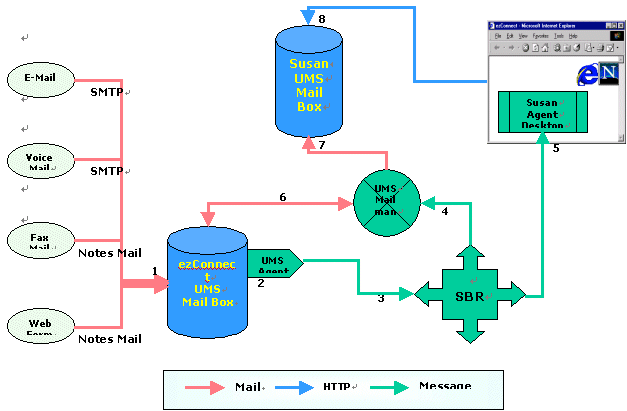 各類外部語音、郵件、WEB、傳真等信息進入呼叫中心會以相應的格式直接被放入ezConnect統(tǒng)一郵件服務器(1),消息經(jīng)過UMS Agent 模塊被提取出信息主題和關鍵字(2),這些主題和關鍵字被送入基于技能的路由選擇模塊SBR(3),由SBR進行分析,選擇出最合適服務的座席(例如是Susan);之后SBR通知郵件轉(zhuǎn)發(fā)器(4)去ezConnect統(tǒng)一郵件服務器中取相應的郵件(6),將郵件放入最佳座席(Susan)的UMS信箱中(7)(8),與此同時座席Susan的界面上顯示出她有一封新的郵件(5)。至此,完成了座席Susan 接收UMS信件的全過程。