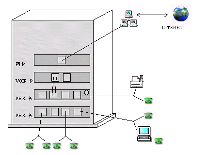 圖中假設客戶安裝了兩塊PBX板卡和一塊VOIP板卡,產(chǎn)品的板卡都插在計算機主板上的插槽上。系統(tǒng)的布線如圖所示,PBX板卡上有外線端口和分機端口(ISA型號的每個插口接4條線、PCI型號的每個插口接2條線),外線接在外線端口上,分機線接在分機端口上。VOIP板卡有2個插口,每個插口接2條線。用戶如果要使用VOIP功能,需要從分機端口接出線到VOIP端口中?蛻羰褂镁W(wǎng)絡電話時,只要呼叫連接VOIP端口的分機號碼即可撥通網(wǎng)絡電話。
