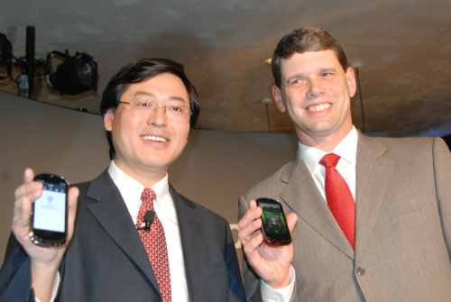 圖:聯(lián)想集團(tuán)CEO楊元慶和COO Rory Read向與會(huì)者展示聯(lián)想集團(tuán)首款智能手機(jī)樂phone