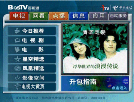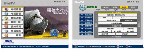 上海IPTV業(yè)務(wù)自2006年9月1日放號以來,發(fā)展十分迅速。截止10月7日,上海電信IPTV業(yè)務(wù)共計發(fā)展用戶達2.2萬。如下是上海IPTV商用系統(tǒng)EPG頁面: