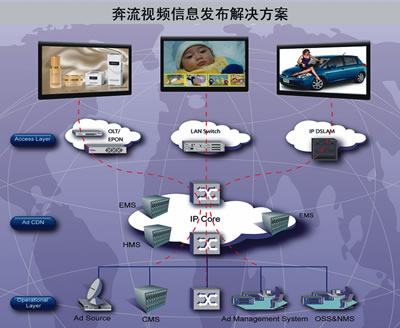 UT斯達康緊跟市場發(fā)展趨勢和運營商步伐,深入研究戶外液晶廣告業(yè)務的發(fā)展、大力推進廣告平臺的研發(fā)。2006年,UT斯達康推出了奔流(RollingStream)視頻信息發(fā)布解決方案(如圖2所示)。奔流視頻信息發(fā)布解決方案是以奔流(RollingStream)IPTV平臺為基礎,結合戶外液晶廣告市場需求,融合運營商以視頻為主的綜合信息發(fā)布的需求,真正運營級的電信級解決方案。該方案可以幫助運營商實現(xiàn)融合信息服務和廣告業(yè)務的統(tǒng)一運營,幫助運營商開展兼具公益性和盈利性的信息發(fā)布業(yè)務,運營商在推進社會信息化、造福公眾的同時,通過視頻廣告的運營,也能獲取盈利。該方案基于電信級平臺的穩(wěn)定性、安全性、擴展性設計要求,可支持百萬級大規(guī)模部署能力,可提供電信級質量保證的服務;該方案基于IP流媒體技術,可通過IP網(wǎng)絡實時、精準、互動地投放廣告內(nèi)容,從而可以支持豐富、新穎的廣告運營模式;該方案基于數(shù)字多媒體技術,除了可以發(fā)布視頻廣告,還可以發(fā)布圖片、文字、消息等廣告內(nèi)容。