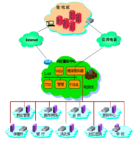 以國(guó)際標(biāo)準(zhǔn)的VXMLl技術(shù)為主導(dǎo)的小區(qū)服務(wù)中心系統(tǒng)可以與互聯(lián)網(wǎng)輕易地連通,從而為小區(qū)的服務(wù)網(wǎng)點(diǎn)走出小區(qū)的地域限制做好技術(shù)上的儲(chǔ)備。vxml的易開(kāi)發(fā)和易擴(kuò)展性,使得遠(yuǎn)程服務(wù)的增加,幾乎不需要任何成本的追加,任何第三方服務(wù)提供者具備vxml業(yè)務(wù),都可以直接掛到服務(wù)中心上來(lái)。