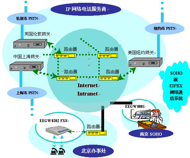目前,在全球各地蓬勃發(fā)展起一項(xiàng)新興行業(yè)——IP網(wǎng)絡(luò)電話服務(wù)商,他們利用遍布全球、資源豐富的Internet / Intranet網(wǎng)絡(luò),組織自己的IP電話核心網(wǎng)絡(luò),將該網(wǎng)絡(luò)的服務(wù)開放給各地的公眾。其核心網(wǎng)絡(luò)的網(wǎng)關(guān)完全遵照ITU-T H.323標(biāo)準(zhǔn),可以解決電話號碼與IP地址的映射,IP地址解析,路由尋路等問題。能夠?qū)崿F(xiàn)SOHO族通過該網(wǎng)絡(luò)接入全球各地的市話。