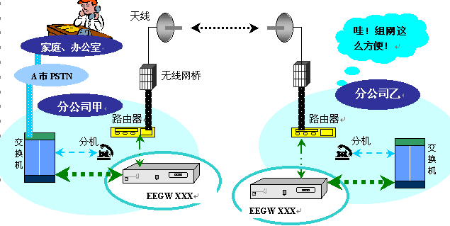 根據(jù)話音業(yè)務(wù)量的大小,在路由器或局域網(wǎng)交換機(jī)后端配置E1接口網(wǎng)關(guān)(EEGW 8601 E1、EEGW 8602 E1、EEGW 8604 E1)或FXO接口六路網(wǎng)關(guān)(EEGW 8566 FXO),然后連接企業(yè)交換機(jī)或集團(tuán)電話。