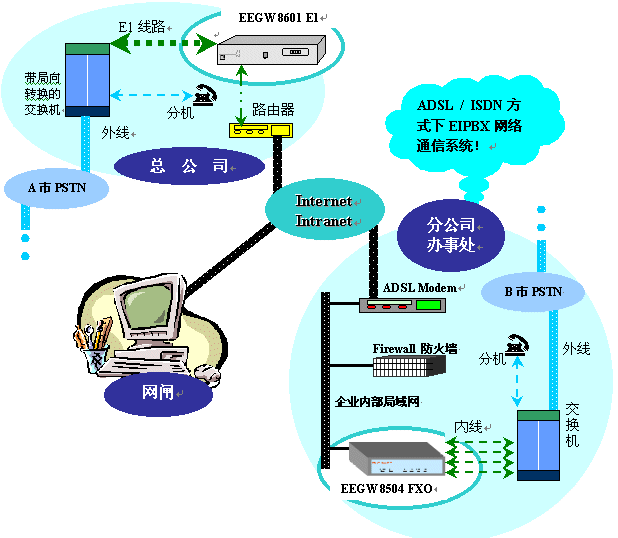為實(shí)現(xiàn)地理位置分散的各企業(yè)分支機(jī)構(gòu)間的語音通信,節(jié)約企業(yè)內(nèi)部的通信成本和管理成本,許多公司在選擇ADSL或ISDN等其他寬帶接入技術(shù)接入Internet,同時希望利用該網(wǎng)絡(luò)建立內(nèi)部的EIPBX網(wǎng)絡(luò)通信系統(tǒng)。