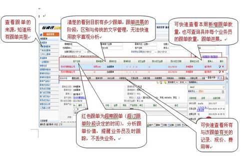 2、通過軟件對跟單的業(yè)務(wù)進(jìn)展記錄固化,清晰掌握該跟單由誰創(chuàng)建、誰去談單、報(bào)價(jià)有無競爭對手、有無難點(diǎn)等進(jìn)展一覽無余,避免了傳統(tǒng)的電話、面對面溝通。