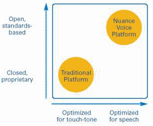 傳統(tǒng)的平臺是基于封閉的、非統(tǒng)一標準的技術(shù)并為按鍵式輸入應(yīng)用而設(shè)計的,而Nuance NVP平臺是開放的、基于統(tǒng)一標準的語音平臺產(chǎn)品,它能夠支持客戶公司已有的IT投資和基礎(chǔ)設(shè)備,同時可以加入語音的應(yīng)用,提高了信息傳遞的自動化程度和客戶的滿意度。