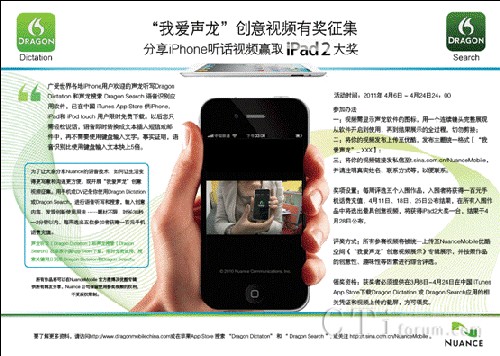 為了讓大家分享Nuance的語(yǔ)音技術(shù)如何改變我們的生活,讓生活變得更寫(xiě)意和溝通更方便,Nuance 公司發(fā)起了“我愛(ài)聲龍”創(chuàng)意視頻征集活動(dòng)。用手機(jī)或DV記錄下你使用Dragon Dictation 或Dragon Search,進(jìn)行語(yǔ)音聽(tīng)寫(xiě)和搜索,輸入創(chuàng)意內(nèi)容、發(fā)現(xiàn)創(chuàng)新使用方法……題材不限,時(shí)長(zhǎng)30秒—2分鐘以內(nèi)。每周選出五位參加者獲贈(zèng)一百元手機(jī)話費(fèi)充值。