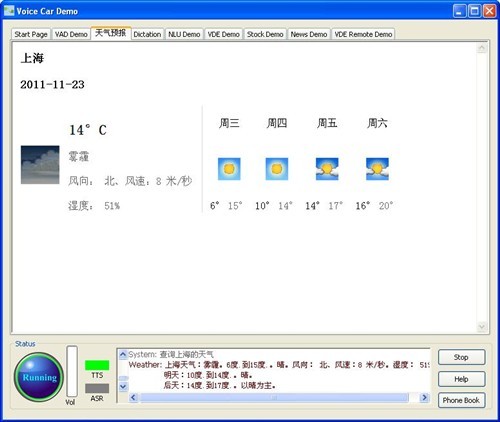 比方說這個關(guān)于空調(diào)問題,我們過去,空調(diào)的命令詞是“把空調(diào)打開,空調(diào)溫度提高3度!爆F(xiàn)在我也可以這樣說,空調(diào)調(diào)高一點,我有點冷,也可以。就是你在車里邊完全可以用你自己的語言來說你想干的事。比如說,前邊你不知道明天天氣會怎么樣,人一般都會想想,明天天氣如何,或者是告訴我天氣預(yù)報。但是你也可以這樣說。明天會下雨嗎?也可以這樣說;蛘吣氵@樣說,你說,今天大盤怎么樣。完全是用自然語言來說。堵不堵車,“查詢交通情況!边@就是,實際上可以有各種不同的說法來完成這個任務(wù),這是我們自然語言的一個演示。