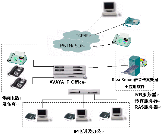 針對現(xiàn)代企業(yè)辦公通信的特點和要求,Avaya與Eicon經過嚴格的產品互操作測試,及應用調試共同推出了企業(yè)一體化辦公平臺解決方案,該解決方案整合了兩家公司的交換機、語音傳真板卡的各自優(yōu)勢,既可以應用于傳統(tǒng)的網絡環(huán)境,又能應用于純IP的通信環(huán)境,將不同的應用技術和網絡結合起來,做到真正的辦公一體化。