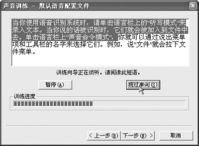 麥克風設置完成以后,系統(tǒng)會進行語音識別的訓練。首先要求您確認一些聲音基本信息,接著點擊“下一步”,系統(tǒng)給出一個例句,您可以點擊“示例”按鈕聽一聽應該如何朗讀這樣的句子。之后,再次點擊“下一步”就可以開始語音訓練了。