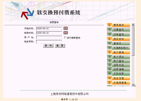 - 話費查詢:可根據用戶名稱(代理商名稱)、主叫號碼(或號碼段)、起止時間等條件快速查詢通話費用。