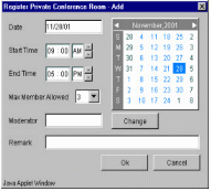TeleConference系統(tǒng)內(nèi)的任一個(gè)分機(jī),都可以利用瀏覽器(Internet Browser)來預(yù)約會(huì)議時(shí)間,而參加會(huì)議的人可以在會(huì)議開始時(shí),自動(dòng)打電話進(jìn)系統(tǒng)參加會(huì)議就像加入“聊天室“一樣簡單。