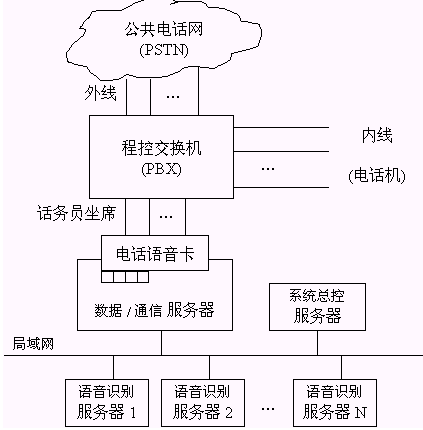 這是一個易擴展的系統(tǒng)結(jié)構(gòu)。當話務(wù)員坐席規(guī)模較大時,系統(tǒng)可增加多臺識別服務(wù)器并立即生效而不需進行特殊的配置,當話務(wù)員坐席規(guī)模較小時,上述各個"邏輯"的軟件服務(wù)器可運行在同一臺"物理"的機器上,從而在保證整體系統(tǒng)性能的前提下,降低硬件的成本。