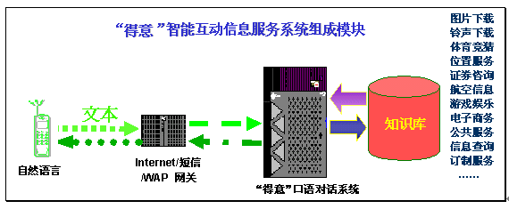 在現(xiàn)有的數(shù)據(jù)通信和信息服務的技術平臺上,加入"得意口語對話系統(tǒng)運行平臺",就能夠讓用戶在通過Internet/SMS/WAP等各種通信手段,在電腦、手機等設備上以自然語言的形式享受相關領域的智能互動信息服務。