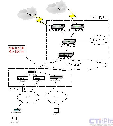 南通廣電目前的IP網(wǎng)絡拓撲如下圖所示,現(xiàn)有電視塔總前端機房1個;分機房共有4個,每個分機房的情況相同。個人用戶以cable modem用戶為主,用戶通過HFC網(wǎng)絡接入頭端(cmts),再經(jīng)匯聚交換機接入廣電城域網(wǎng)后經(jīng)電視塔總前端機房訪問internet,新的頭端系統(tǒng)采用Cisco 公司的ubr10012和ubr7246,目前暫決定cable modem和用戶的PC設備均通過DHCP服務器(Cisco 的CNR軟件)獲得IP地址;Lan用戶除接入方式不同外,IP地址采用靜態(tài)分配的辦法。目前廣電為部分個人用戶分配公網(wǎng)IP地址,其他個人用戶分配私網(wǎng)地址由出口防火墻通過NAT完成地址轉(zhuǎn)換。