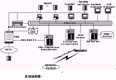 交換機(jī)實(shí)現(xiàn)電話呼入、呼出功能;還需要提供自動(dòng)排隊(duì)機(jī)系統(tǒng),用于實(shí)現(xiàn)對(duì)來(lái)話的均衡分配;呼叫管理系統(tǒng),用于有效管理所有話務(wù);支持IVR;提供CTI Link模塊作為計(jì)算機(jī)/電話集成接口;同時(shí),交換機(jī)還可作為辦公電話交換機(jī)使用,系統(tǒng)可支持多家公司的交換機(jī)。